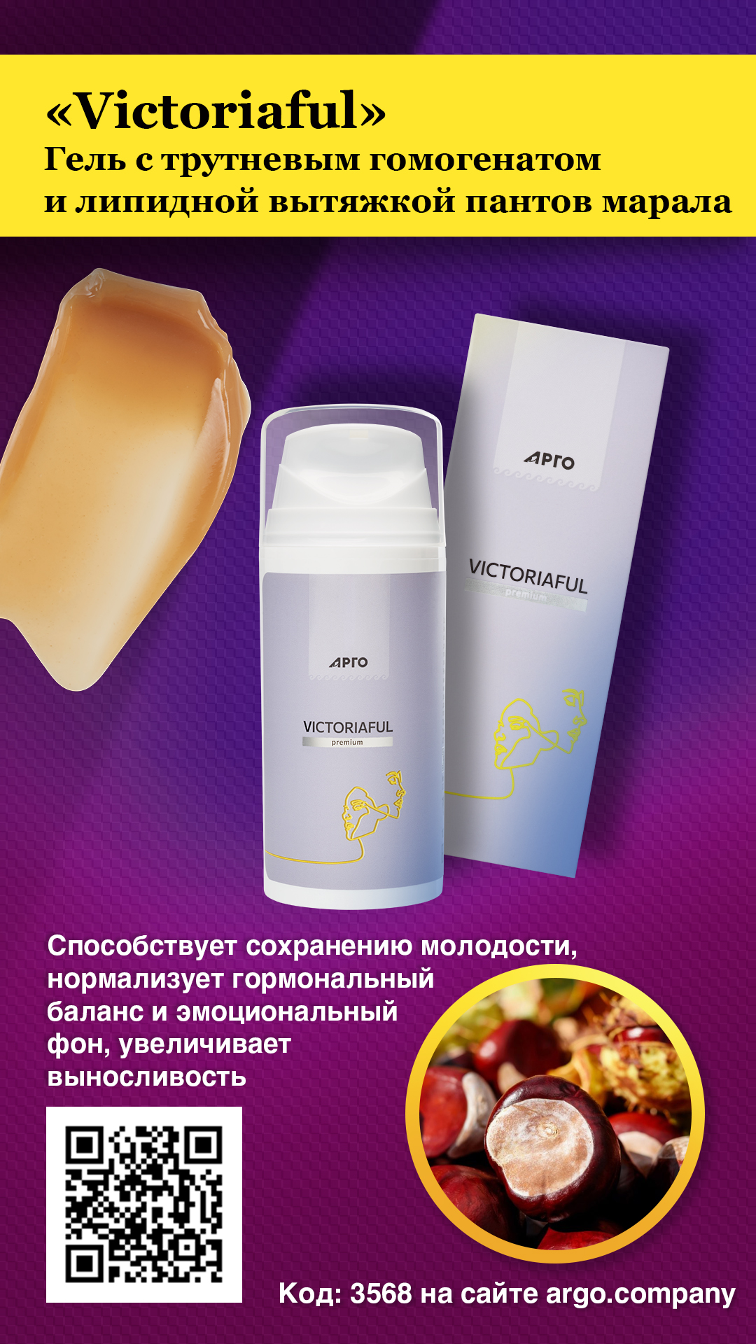 Victoriaful – уникальный гель на основе комплекса природных компонентов, способствующих сохранению молодости, нормализации гормонального баланса и эмоционального фона, увеличению выносливости, работоспособности, улучшению работы головного мозга, укреплению стенок сосудов.