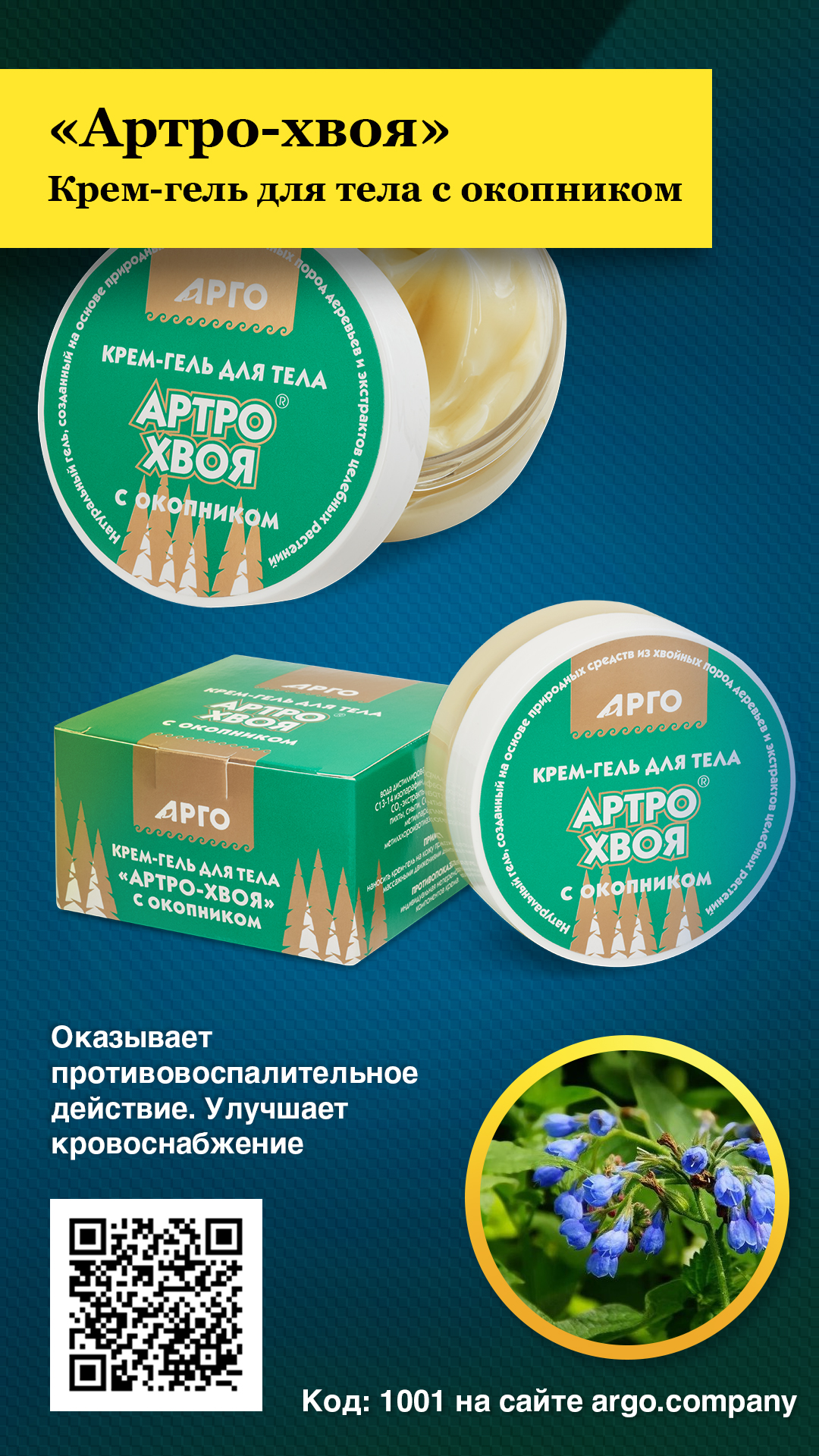 Эффективность крем-геля для тела обусловлена целебными свойствами и синергизмом действия входящих в него компонентов (экстракты окопника, черного и красного перца, пихты, сныти, масло пихты сибирской).