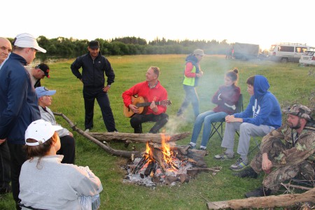 Следующая остановка лагерем на ночлег была на реке Бирюса. Установили палатки, подняли флаг Движения «За сбережение народа», развели костер, приготовили ужин, искупались в реке. А чего только стоили душевные песни Евгения Иванова под гитару у костра, а грибной суп и чай с комарами – этого словами не передать.